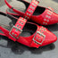 These slingback flats have a super angular silhouette with a pointed toe. Chunky grommets and oversized buckles give an edge to the wide straps over the top and the toe of this design.